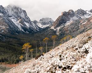 One of my favorite photos I've ever taken. It wasn't supposed to snow this day, it was the beginning of Fall. We set out to get the quintessential Fall in the Sawtooths photos and ended up with frosted mountains. We ambled up a hill and all of the shapes and colors and light just worked together perfectly. I'm limiting this run to 10 prints.